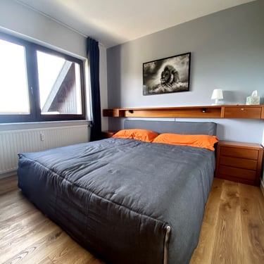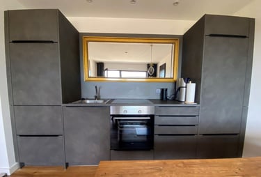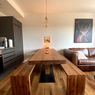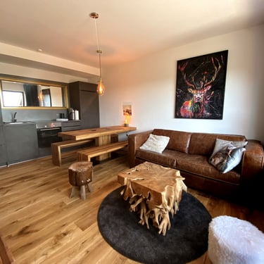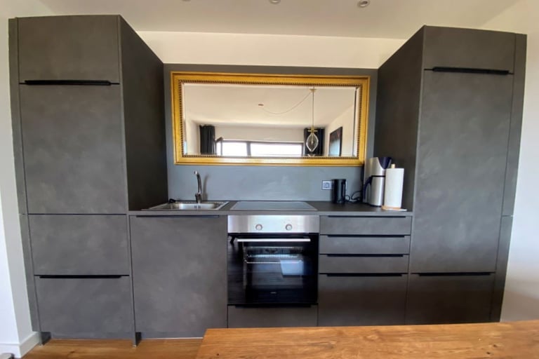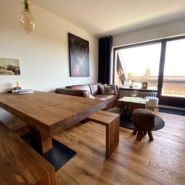Unser Appartement, Ende 2019 komplett renoviert und im rustikal-modernen Stil neu möbliert, möchten wir an Feriengäste vermieten, die sich wie wir im Urlaub wie zu Hause fühlen wollen. Mit 54 m², verteilt auf zwei Zimmer und eine etwa 20 m² große Dachterrasse, eignet sich die Ferienwohnung ideal für zwei Personen. Jedoch findet auch eine vierköpfige Familie bequem Platz in den Räumen, die wir mit viel Liebe fürs Detail eingerichtet haben. Hauptraum ist das Wohnzimmer mit offener Küche, Zugang zur Dachterrasse und traumhaftem Ausblick. Hier findet jeder Gast seinen Lieblingsplatz: entweder in der Sitzecke mit Ledersofa , Kuschelkissen und großem LCD-Flachbildschirm oder in dem gemütlichen Essbereich mit Holzmöbeln. Dank intelligenter Ausziehfunktion mit Lattenrost findet man in dem Sofa außerdem eine vollwertige, komfortable Schlafmöglichkeit für zwei Personen. Im separaten Schlafzimmer stehen ein Doppel-Bett mit zwei Komfort-Matratzen und ein großer Kleiderschrank. Das Badezimmer verfügt über eine Dusche.